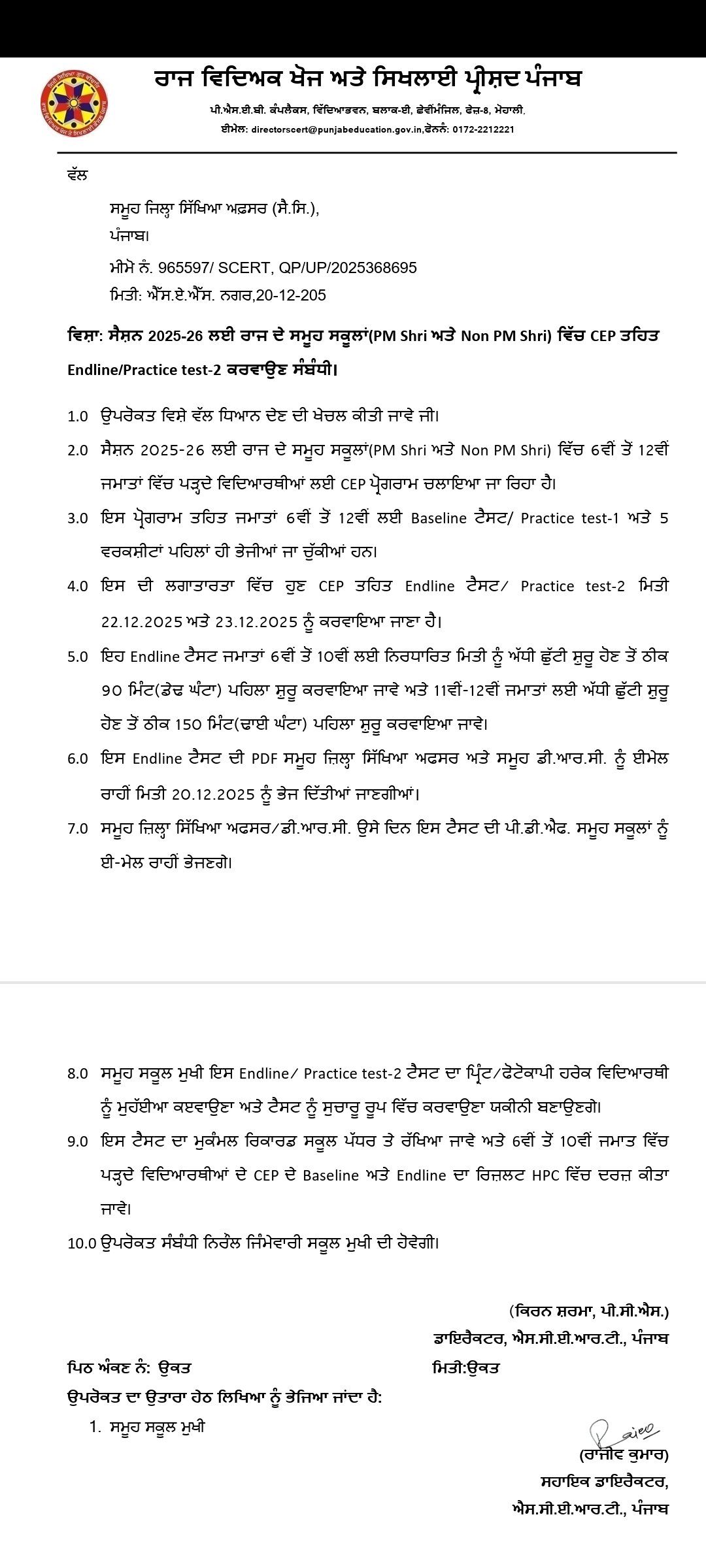 ਸਿੱਖਿਆ ਵਿਭਾਗ ਪੰਜਾਬ ਵੱਲੋਂ ਸਾਰੇ ਸੈਕੰਡਰੀ ਪੱਧਰ 6ਵੀਂ ਤੋਂ 12 ਵੀਂ  ਦੇ ਵਿਦਿਆਰਥੀਆਂ ਨੂੰ ਇਹ ਜਾਣਕਾਰੀ ਦਿੱਤੀ ਜਾਂਦੀ ਹੈ ਕਿ CEP ਅਸਾਈਨਮੈਂਟ 1 ਤੋਂ 5 ਤੱਕ ਦੇ ਅਧਾਰ ’ਤੇ ਕੱਲ ਟੈਸਟ ਕਰਵਾਇਆ ਜਾਵੇਗਾ।