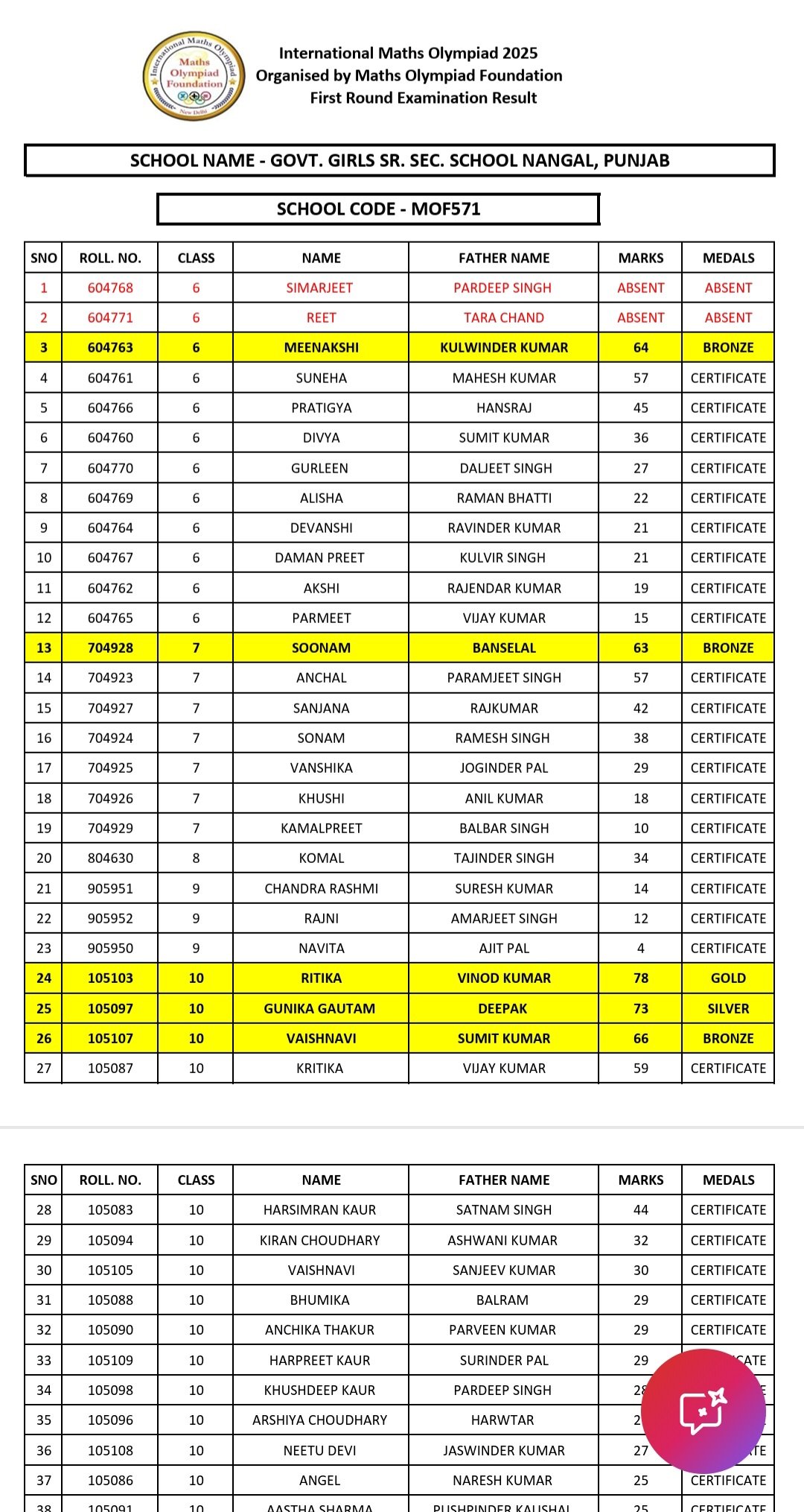 Nangal (Rupnagar), 27 December : Students of Govt. Girls Senior Secondary School, Nangal, Punjab delivered an impressive performance in the International Maths Olympiad 2025, organized by the Maths Olympiad Foundation and Examination results were announced recently.