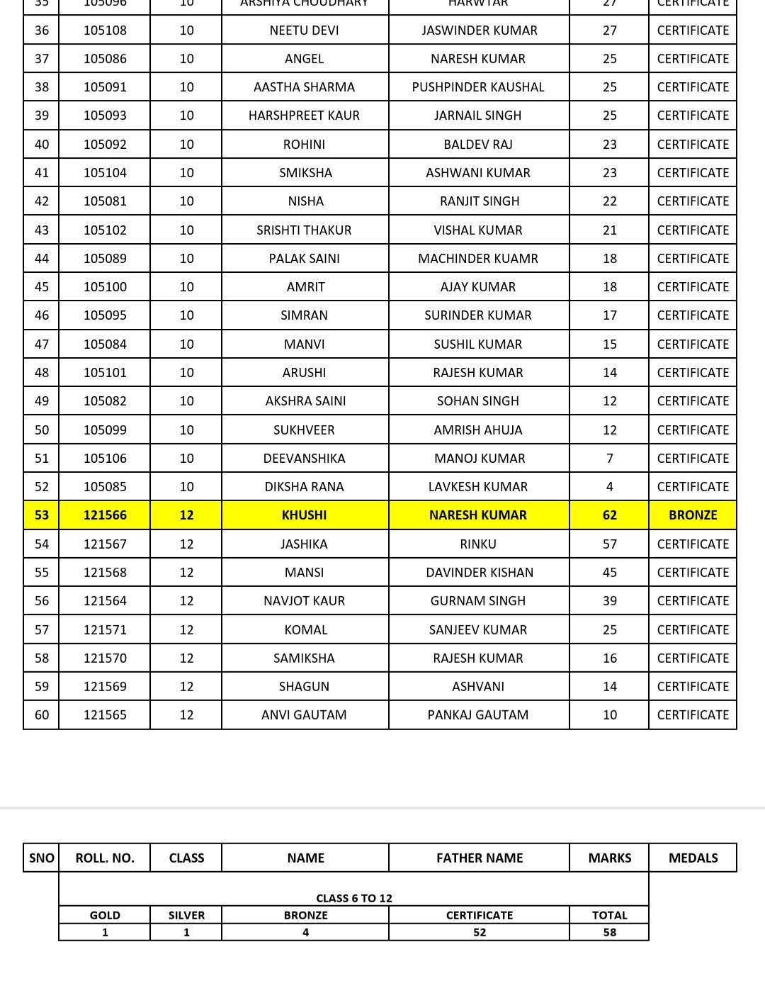 From Class 12, Khushi achieved a Bronze Medal, while Jashika, Mansi, Navjot Kaur, Komal, Samiksha, Shagun, and Anvi Gautam were awarded participation certificates.
