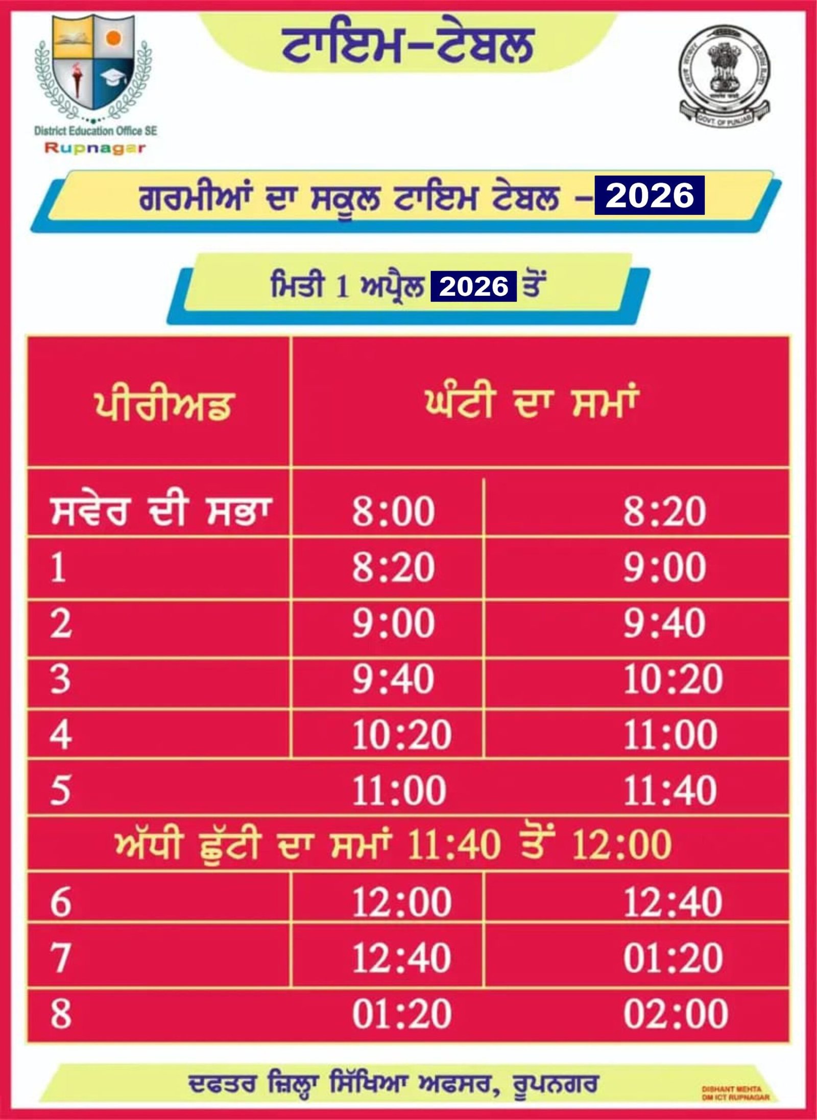 Home - Ropar News - SUMMER PSEB SCHOOL TIME TABLE 2026SUMMER PSEB SCHOOL TIME TABLE 2026 Leave a Comment / By Dishant Mehta / March 31, 2026 SUMMER PSEB SCHOOL TIME TABLE 2026DOWNLOAD & PRINTSUMMER PSEB SCHOOL TIME TABLE 2026District Ropar News Study Material District Ropar News – FacebookShare this: Share on WhatsApp (Opens in new window) WhatsApp Share on Facebook (Opens in new window) Facebook Share on Telegram (Opens in new window) Telegram Share on X (Opens in new window) X Print (Opens in new window) Print Email a link to a friend (Opens in new window) Email Related Related Posts ਪੰਜਾਬ ਭਰ ਦੇ ਸਰਕਾਰੀ ਸਕੂਲਾਂ ‘ਚ ਨਵਾਂ ਨਿਯਮ ਲਾਗੂ: MIS 2.0 ‘ਤੇ ਹਾਜ਼ਰੀ ਲਾਜ਼ਮੀ, ਮਾਪਿਆਂ ਨੂੰ ਆਉਣਗੇ SMS ਅਲਰਟ Leave a Comment / Ropar News / By Dishant Mehta ਸਰਕਾਰੀ ਕੰਨਿਆ ਸੀਨੀਅਰ ਸੈਕੰਡਰੀ ਸਕੂਲ, ਸ੍ਰੀ ਅਨੰਦਪੁਰ ਸਾਹਿਬ ਵਿੱਚ Mega PTM ਦੌਰਾਨ ਸਲਾਨਾ ਨਤੀਜੇ ਘੋਸ਼ਿਤ Leave a Comment / Ropar News / By Dishant Mehta ਰੂਪਨਗਰ: ਜ਼ਿਲ੍ਹਾ ਪੱਧਰੀ ਸਮੀਖਿਆ ਮੀਟਿੰਗ ਸਫਲਤਾਪੂਰਵਕ ਆਯੋਜਿਤ Leave a Comment / Ropar News / By Dishant Mehta ਨਵੇਂ ਕੰਪਿਊਟਰਾਂ ‘ਚ ਵਾਰ-ਵਾਰ ਲੋਗਿਨ ਤੋਂ ਛੁਟਕਾਰਾ: Autologon ਬਣਿਆ ਆਸਾਨ ਹੱਲ Leave a Comment / Ropar News, Poems & Article / By Dishant Mehta Rupnagar Educators Attend Capacity Building Workshop at DGSC Office Leave a Comment / Ropar News / By Dishant Mehta ਸ਼ਹੀਦ ਭਗਤ ਸਿੰਘ: ਸਿਰਫ਼ ਇਕ ਨਾਮ ਨਹੀਂ, ਇੱਕ ਸੋਚ ਦਾ ਇਨਕਲਾਬ Leave a Comment / Poems & Article, Ropar News / By Dishant Mehta 22 ਮਾਰਚ- ਵਿਸ਼ਵ ਪਾਣੀ ਦਿਵਸ ਤੇ ਵਿਸ਼ੇਸ਼ Leave a Comment / Poems & Article, Ropar News / By Dishant Mehta 28 ਮਾਰਚ ਨੂੰ ਪੰਜਾਬ ਦੇ ਸਰਕਾਰੀ ਸਕੂਲਾਂ ਵਿੱਚ Mega PTM ਦੌਰਾਨ ਘੋਸ਼ਿਤ ਹੋਣਗੇ ਸਲਾਨਾ ਨਤੀਜੇ Leave a Comment / Ropar News / By Dishant Mehta Computer Science Grading : Download Excel File with Formula Leave a Comment / Ropar News, Study Material / By Dishant Mehta Adolescent Health Training Program Organized Successfully at Roopnagar Leave a Comment / Ropar News / By Dishant Mehta ਝੱਲੀਆਂ ਕਲਾਂ ਸਕੂਲ ਵਿਖੇ ਆਈਸੀਟੀ ਲੈਬ ਦਾ ਉਦਘਾਟਨ, ਵਿਦਿਆਰਥੀਆਂ ਲਈ ਡਿਜ਼ਿਟਲ ਸਿੱਖਿਆ ਵੱਲ ਵੱਡਾ ਕਦਮ Leave a Comment / Ropar News / By Dishant Mehta ਸਰਕਾਰੀ ਕੰਨਿਆ ਸੀਨੀਅਰ ਸੈਕੰਡਰੀ ਸਮਾਰਟ ਸਕੂਲ ਰੂਪਨਗਰ ਵਿੱਚ 17 ਨਵੇਂ ਕੰਪਿਊਟਰਾਂ ਅਤੇ 2 ਇੰਟਰੈਕਟਿਵ ਪੈਨਲਾਂ ਦਾ ਉਦਘਾਟਨ Leave a Comment / Ropar News / By Dishant Mehta ਆਦਰਸ਼ ਸਕੂਲ ਲੋਧੀਪੁਰ ਨੂੰ ਮਿਲੇ 17 ਨਵੇਂ ਕੰਪਿਊਟਰ ਤੇ 6 ਸਮਾਰਟ ਇੰਟਰਐਕਟਿਵ ਪੈਨਲ Leave a Comment / Ropar News / By Dishant Mehta ਜਮਾਤ 10ਵੀਂ ਤੋਂ ਬਾਅਦ ਕਿਹੜਾ ਸਟਰੀਮ ਚੁਣੀਏ? ਵਿਦਿਆਰਥੀਆਂ ਲਈ ਪੂਰੀ ਗਾਈਡ Leave a Comment / Ropar News, Study Material / By Dishant Mehta Deorpr.com ਨੇ ਪਾਰ ਕੀਤਾ 11 ਲੱਖ Page Views ਦਾ ਅੰਕੜਾ Leave a Comment / Ropar News / By Dishant Mehta ਪੰਜਾਬ ਦੇ ਸਰਕਾਰੀ ਸਕੂਲਾਂ ਨੂੰ ਮਿਲ ਰਹੀਆਂ ਨਵੀਆਂ ਕੰਪਿਊਟਰ ਲੈਬਾਂ, ਬਾਸੋਵਾਲ ਵਿੱਚ ਵੀ ਉਦਘਾਟਨ Leave a Comment / Ropar News / By Dishant Mehta