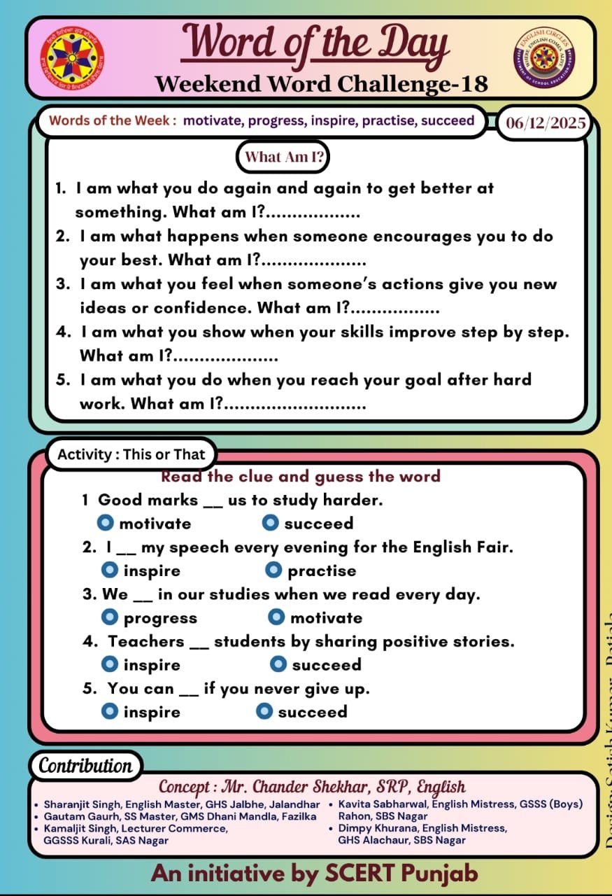 Home - Study Material - Weekend word challenge sheet no 18Weekend word challenge sheet no 18 Leave a Comment / By Dishant Mehta / December 6, 2025 Weekend word challenge sheet no 18 Weekend word challenge sheet no 18Share this: Click to share on WhatsApp (Opens in new window) WhatsApp Click to share on Facebook (Opens in new window) Facebook Click to share on Telegram (Opens in new window) Telegram Click to share on X (Opens in new window) X Click to print (Opens in new window) Print Click to email a link to a friend (Opens in new window) Email Related Related Posts CEP Assignment 3 Non PM Shri Schools for classes 6th to 10th Leave a Comment / CEP, Ropar News, Study Material / By Dishant Mehta Word of the day Leave a Comment / Study Material, Ropar News / By Dishant Mehta BAGLESS DAY 26TH JULY 2025 Leave a Comment / Study Material / By Dishant Mehta ਮਿਸ਼ਨ ਸਮਰੱਥ 6ਵੀਂ ਤੋਂ 8ਵੀਂ ਗਰਮੀਆਂ ਦੀਆਂ ਛੁੱਟੀਆਂ ਦਾ ਕੰਮ Leave a Comment / HOLIDAY HOMEWORK, Study Material / By Dishant Mehta Competency Based study material for Class 6th to 8th under CEP Phase-2 Leave a Comment / Study Material / By Dishant Mehta Competency Based study material for Class 11th and 12th under CEP Phase-2 Leave a Comment / CEP, Study Material / By Dishant Mehta Competency Based study material for Class 9th and 10th under CEP Phase-2 Leave a Comment / CEP, Study Material / By Dishant Mehta Khan Academy Weekly Holidays Homework 2024 Leave a Comment / Ropar News, Study Material / By Dishant Mehta Class 9th Simplified Study Material PSEB 2023-24 Leave a Comment / Class 9th, Study Material / By Dishant Mehta How To Fill OMR Sheet in PSEB Board Exam 2024 Leave a Comment / Structure and Model Question Paper 2023-24, Study Material / By Dishant Mehta Last Minute Revision Notes for Class 10th & 12th Computer Science Leave a Comment / Study Material, Class 10th, Class 12th / By Dishant Mehta Structure of Question Paper for 6th, 7th & 8th Leave a Comment / Study Material, Class 8th, Link Online Class / By Dishant Mehta 8th Class PSEB Study Material 2024-25 Leave a Comment / Class 8th, Study Material / By Dishant Mehta PSEB 10th Class Study Material For Final Paper Leave a Comment / Study Material, Class 10th / By Dishant Mehta Class 12th Simplified Study Material 2023-24 Leave a Comment / Class 12th, Study Material / By Dishant Mehta