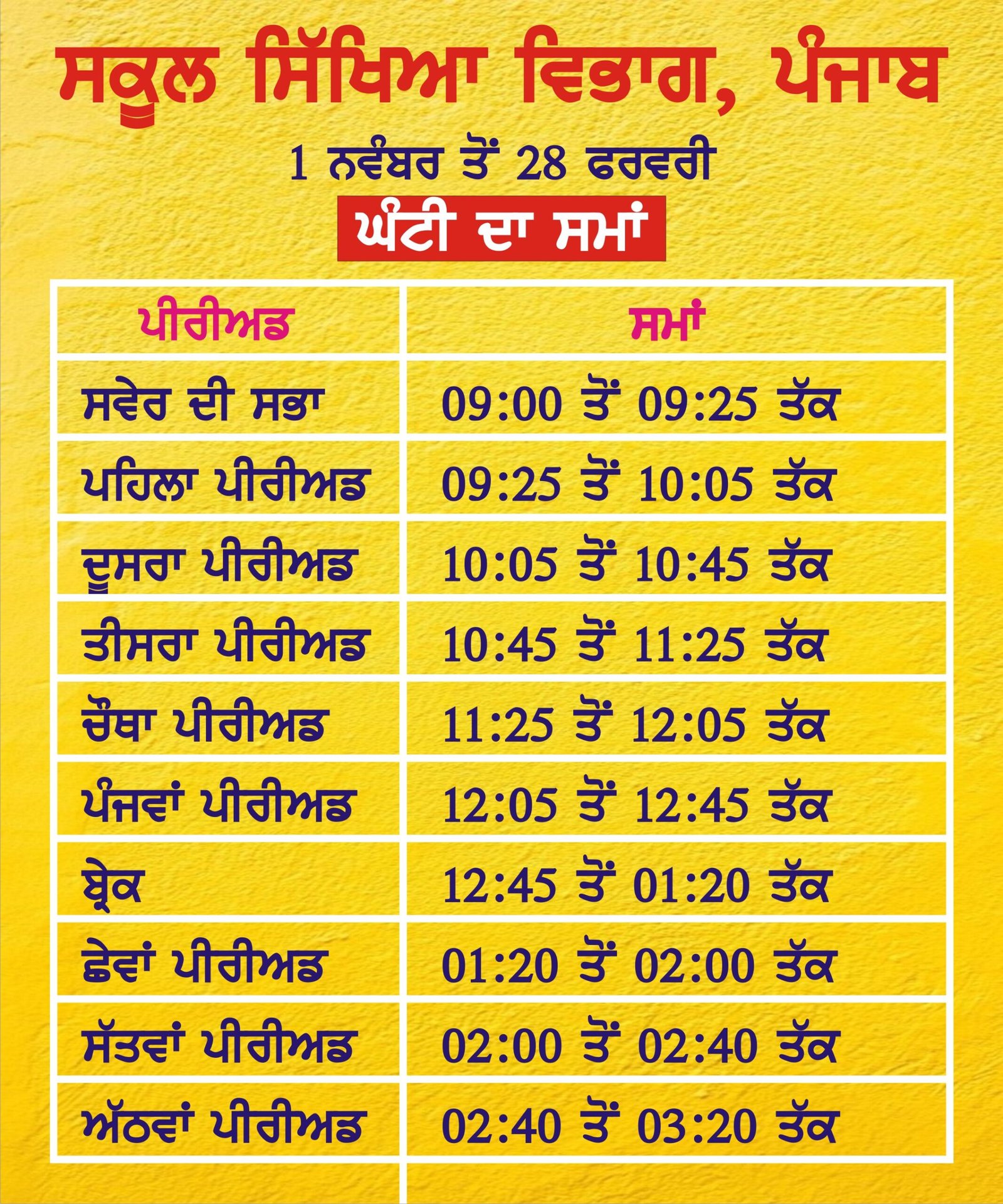 ਸਰਦੀਆਂ ਦੇ ਸਮੇਂ ਦੀ ਸਮਾਂ-ਸਾਰਣੀ (1 ਨਵੰਬਰ – 28 ਫਰਵਰੀ)